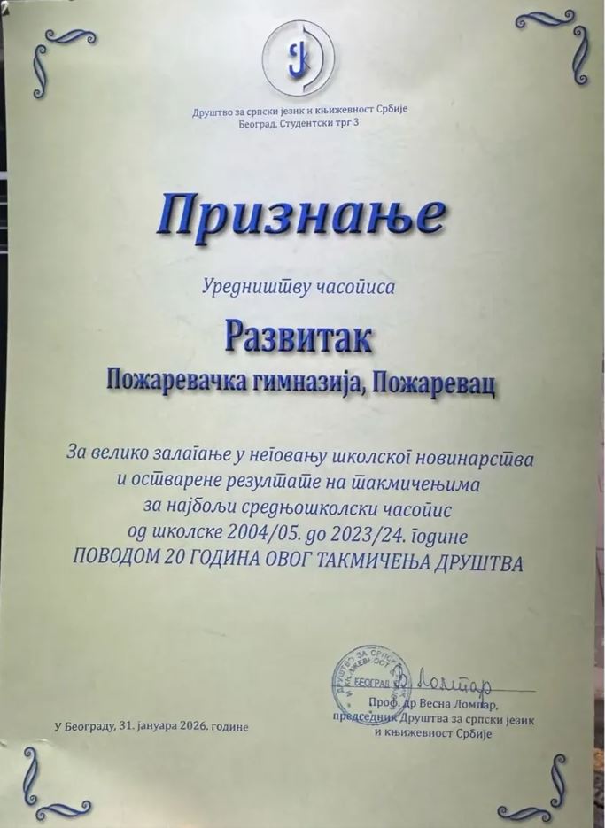 Priznanje je dodeljeno povodom 20 godina takmičenja Društva za srpski jezik, a odnosi se na kontinuitet i uspehe ostvarene od školske 2004/05. do 2023/24. godine. Nagradu su preuzeli Slavica Jovanović, profesor srpskog jezika i književnosti i glavni urednik časopisa „Razvitak“, Nenad Milošević, profesor srpskog jezika i književnosti i član uredništva, kao i Janja Rakić, učenica drugog razreda i član literarne družine „Razvitak“.