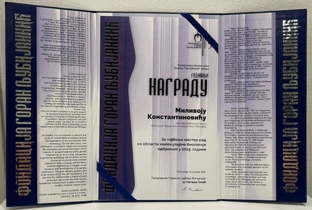 Fondacija „Goran Ljubijankić“ tradicionalno nagrađuje najuspešnije master radove iz oblasti molekularne biologije, podstičući razvoj mladih istraživača i unapređenje naučnog rada u Srbiji.